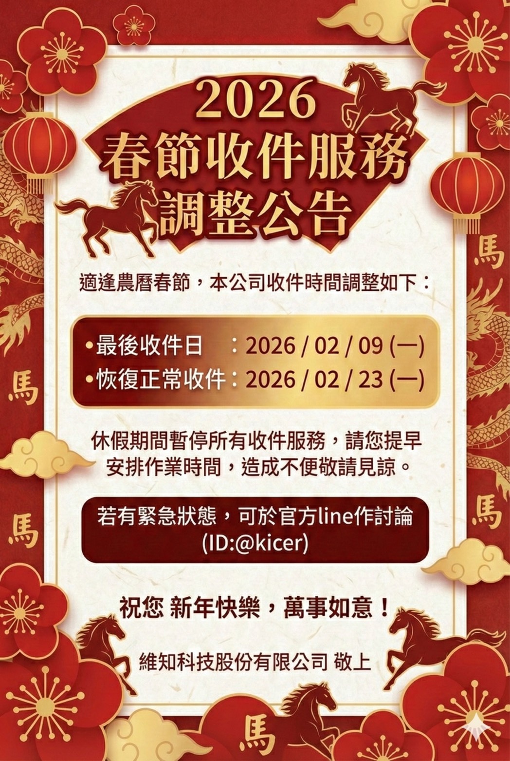 【公告】因農曆年節將至(春節期間),本實驗室將於 2026/02/09 起對外停止收件,並於 年後(2/23,初七)恢復正常收件,若有緊急狀態,可於官方line作討論,造成不便敬請見諒。